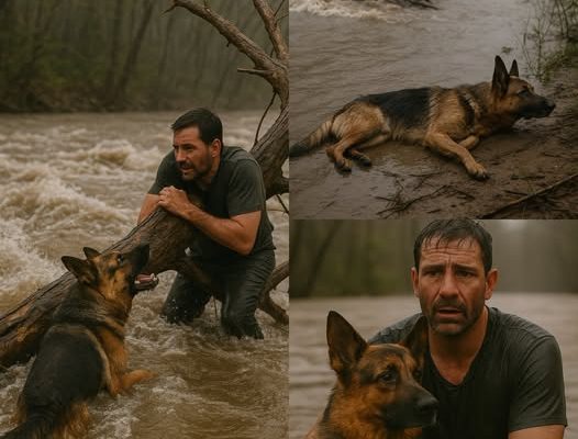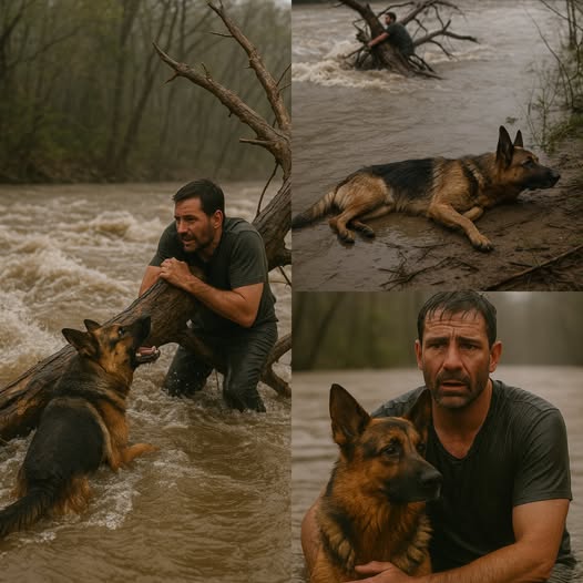 Eyewitnesses recall the moment the German Shepherd plunged into the river without hesitation. Against the violent current, the dog swam directly to the terrified man, barking urgently and nudging him to hold on. The dog stayed by his side, offering a lifeline of hope until human rescuers could arrive.