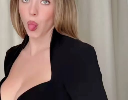 This may contain: a woman in white top and black pants standing next to a dark wall with her hand on her hip
