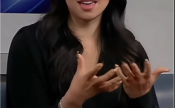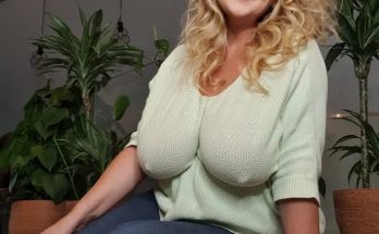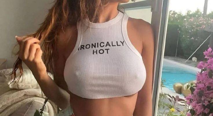 This may contain: a woman in white top and blue shorts standing next to a window with her hand on her hip