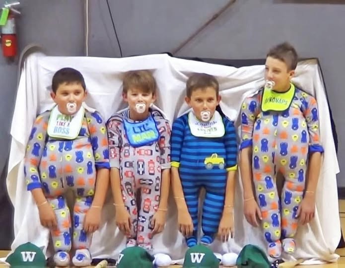 In 2017, a group of four fifth graders from New Braunfels Christian Academy in Texas presented a unique performance at the Elementary Talent Show. To keep their act a surprise, the students began by concealing themselves under a black cloth. When the fabric was finally removed, the audience was met with the sight of the boys wearing infant costumes, complete with small prosthetic legs that they manipulated with their arms. This unexpected sight elicited an immediate burst of laughter from the crowd, setting the stage for what was to come.